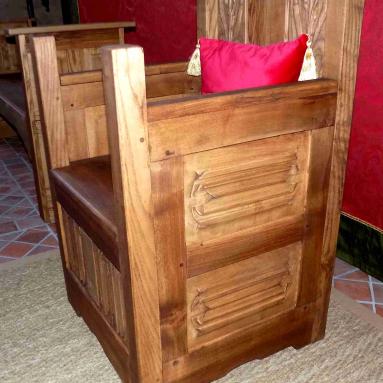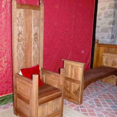 Trône sculpté XV ème siècle : pli de serviette, rinceau, personnages, animaux.