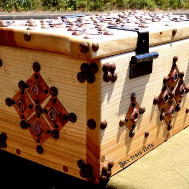 Ce coffret est réalisé dans le style du XVème siècle, fabriqué tout en chêne (ou frêne) avec incrustations de pierreries (pastilles de verre) et cuivre martelé.