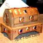 à pied en bois de ma fabrication, ou servir de coffre à bijoux. Suivant les modèles, ils peuvent être fabriqué avec des incrustations de pastilles de verre dans des plaques de cuivre ou décoration en cuivre et laiton
