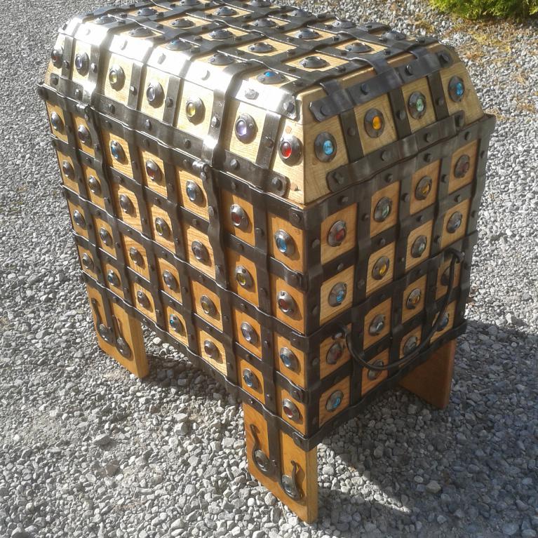 Ce magnifique coffre tout incrusté de verrerie, aux nombreuses ferronneries, est une pièce unique !